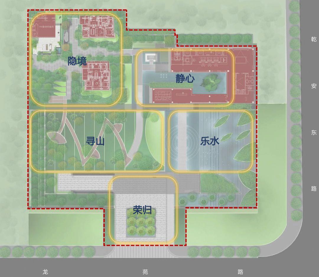 双都宸庐诗画园林示范区,采用景观递进和移步换景的设计手法,通过“荣归—乐水—静心—寻山—隐境”的有机动线,将王维的山水情怀贯穿其间,浓荫之下,屋脊隐现,曲径通幽,移步异景。
