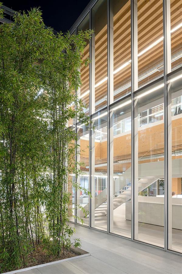 承重结构采用层压木材的预制构件,天花设置一系列约12 x 12 厘米的板条。通透的空间和木制结构清晰地展现在眼前,演绎木材的温暖美观。全玻璃的幕墙延伸至每个楼层,使自然光得以穿透建筑深处,创造高质量的室内环境。