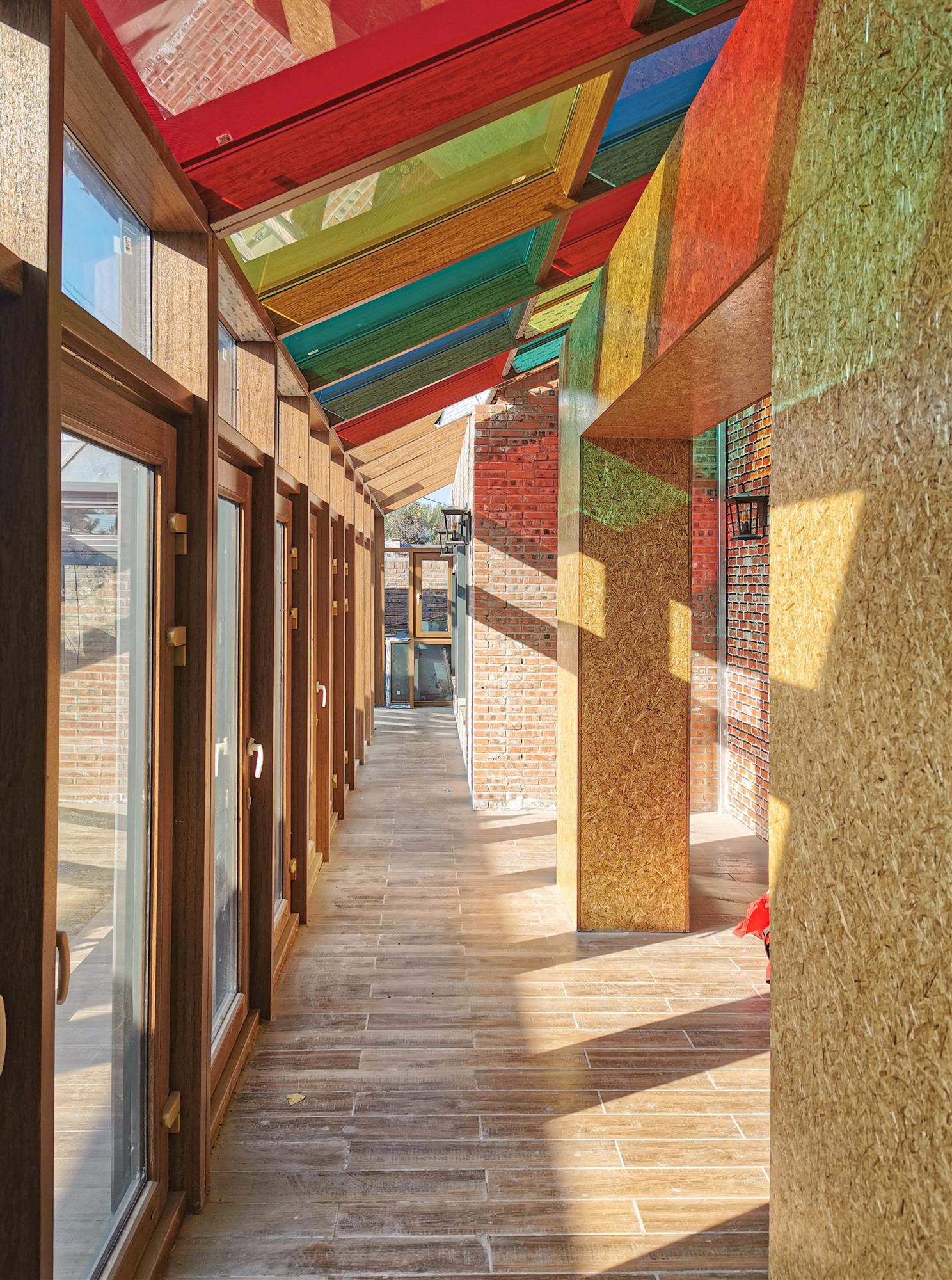 阳光透过彩色薄膜光伏顶落在阳光房的墙面