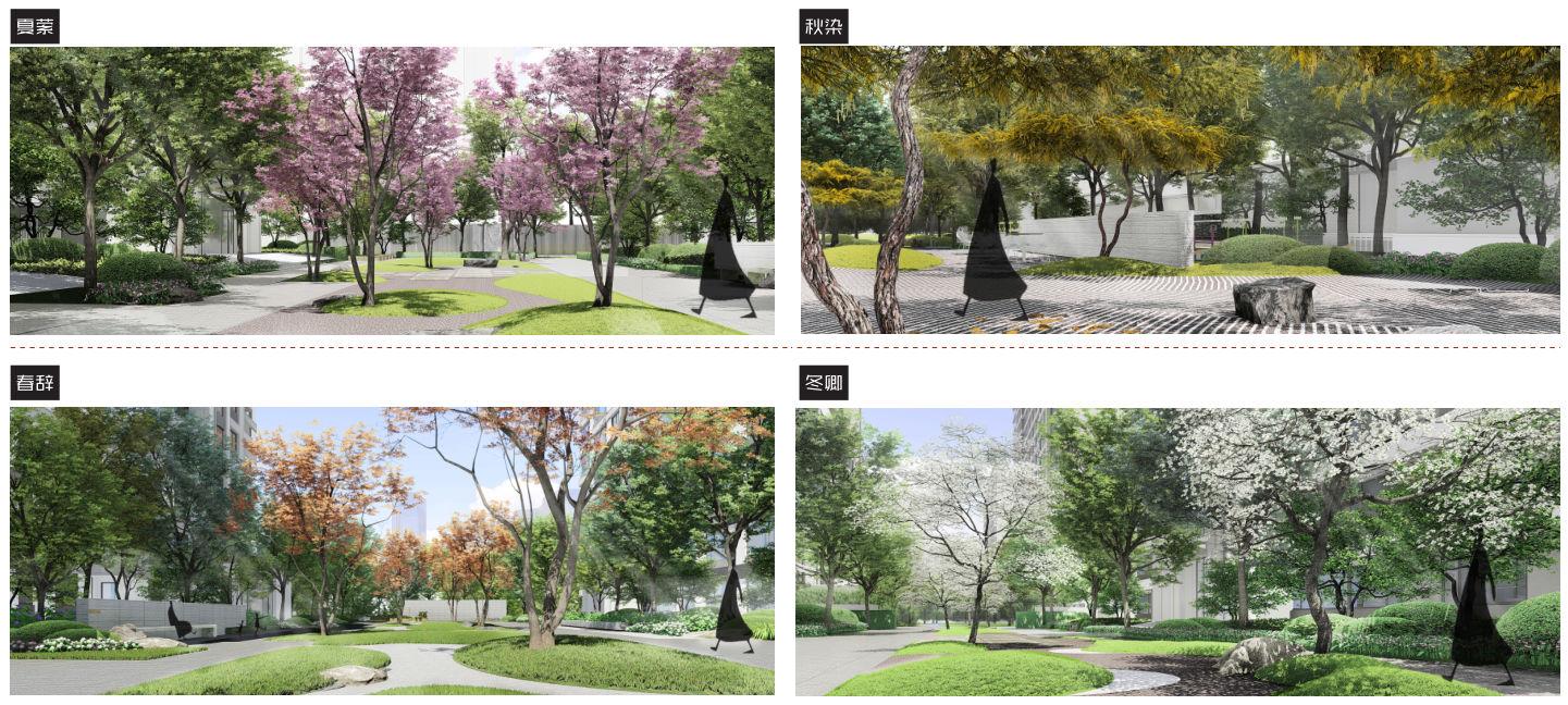 在四庭内分别种植不同主题的开花植物,保证一年四季景色各异,通过社区内外合理的植物种植搭配,利用植物吸收来自外界的噪音。