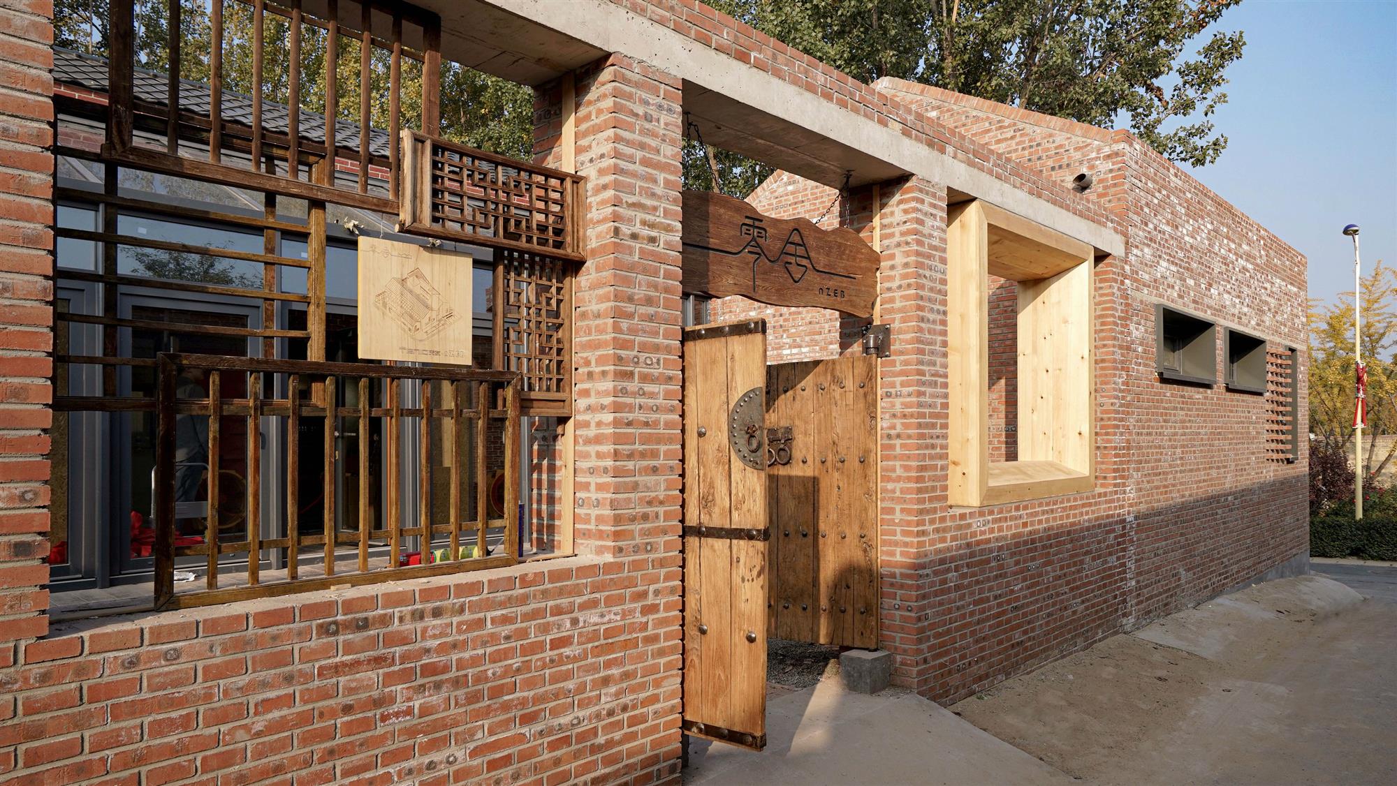 围墙上用拆除的旧窗做出了LOGO